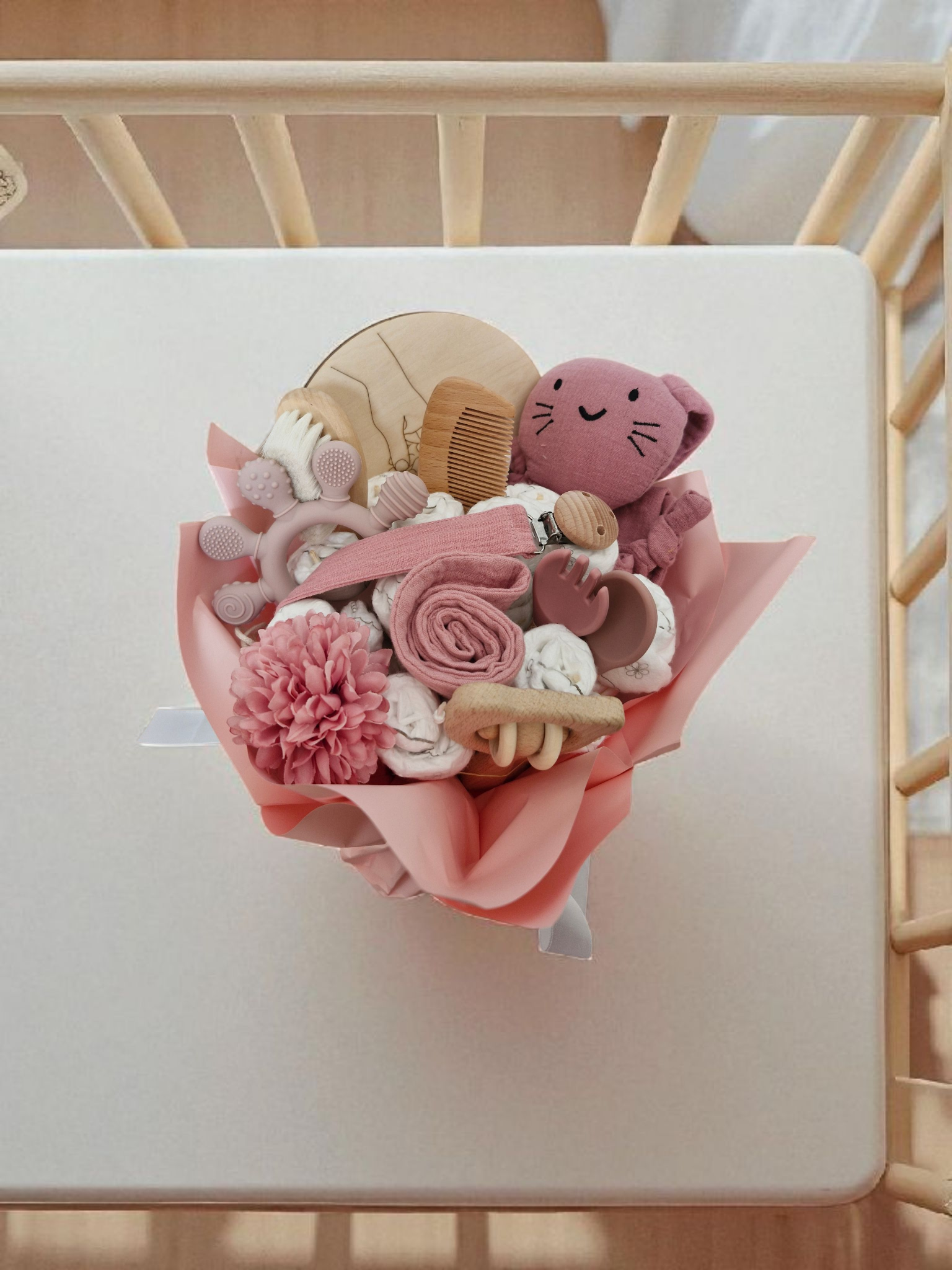 Pour le personnaliser, vous pouvez ajouter en option : bavoirs, doudou, brosse et peigne, hochets, anneau de dentition… Chaque bouquet devient ainsi un cadeau sur-mesure, unique et élégant, avec la touche signature Premier Janvier.