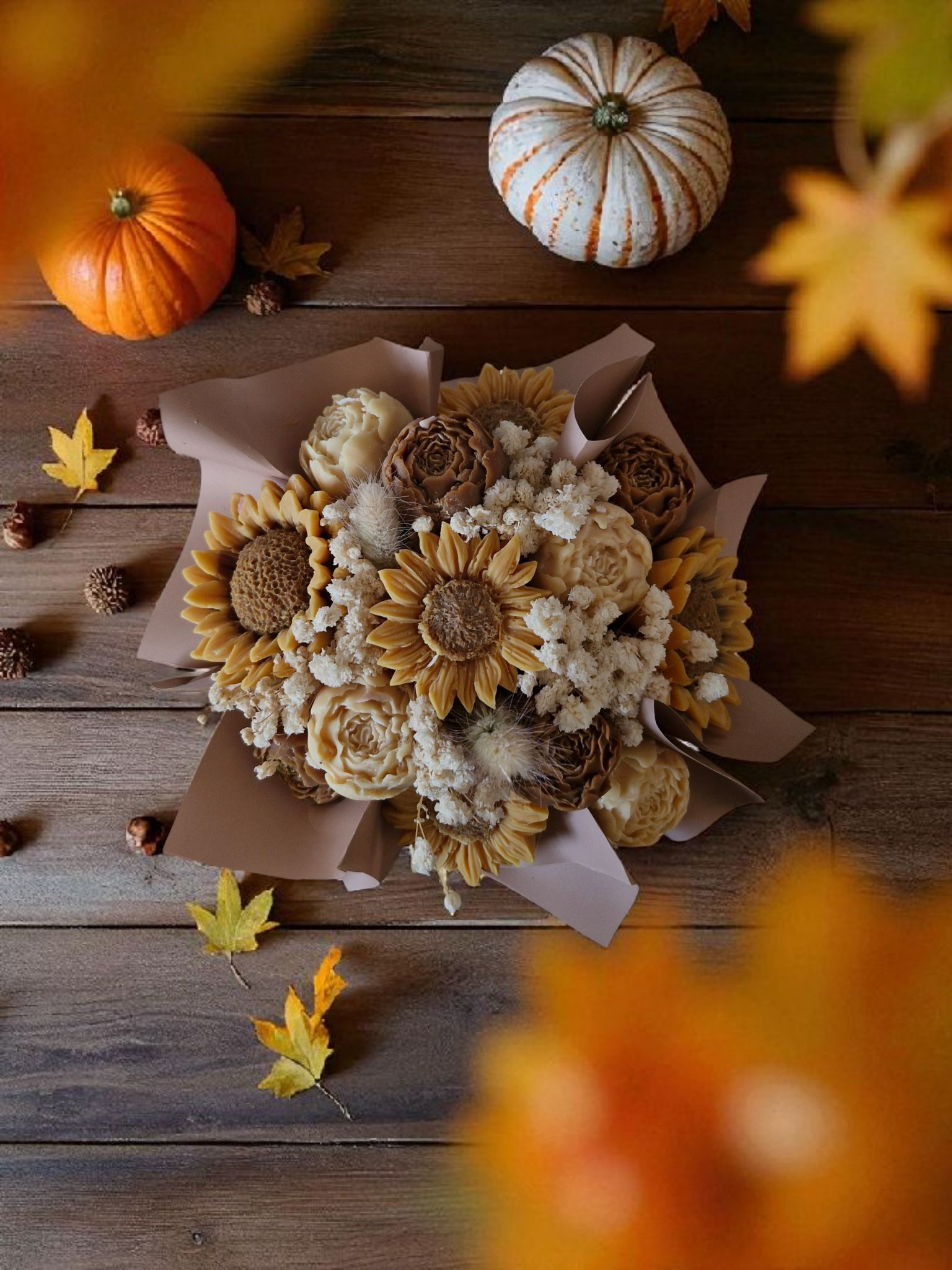 De grands pots artisanaux accueillent de splendides tournesols en cire, façonnés et parfumés à la main. Leurs pétales dorés rayonnent comme un éclat de soleil au cœur de l’automne, diffusant des notes chaleureuses et enveloppantes qui rappellent les champs baignés de lumière et les journées aux couleurs dorées.
